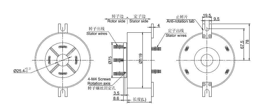• · 外徑119mm, 通孔直徑為25.4mm(適用于<=25.4mm)的標(biāo)準(zhǔn)系列過(guò)孔多通道導(dǎo)電滑環(huán)。*注意:如需<25.4mm的內(nèi)孔,可通過(guò)加內(nèi)襯軸套解決。
